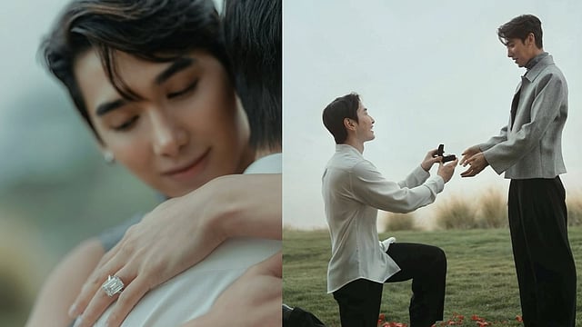 One stunning image shows Plastique embracing her fiancé, her sparkling ring resting on his shoulder. Another beautifully captured shot features her partner on one knee in a dreamy, fog-filled field, surrounded by scattered rose petals.