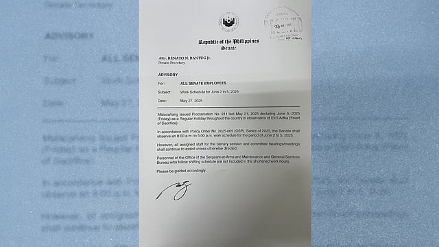 “In accordance with Policy Order No. 2025-005 (OSP), Series of 2025, the Senate shall observe an 8:00 a.m. to 5:00 p.m. work schedule for the period of June 2 to 5, 2025,” Bantug said in an advisory.