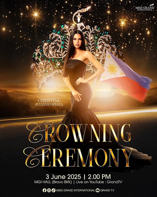 Christine Juliane Opiaza will be officially crowned Miss Grand International 2024 on 3 June, marking the first time a Filipino has won the title.