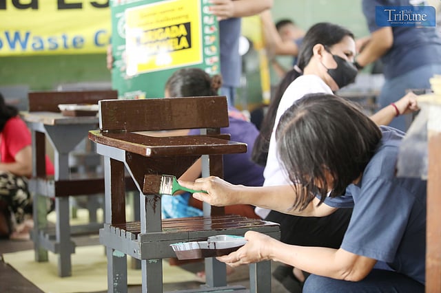EcoWaste Coalition joins teachers, parents, and students in repainting chairs during Brigada Eskwela at Pinyahan Elementary School in Quezon City on Monday, 9 June, in preparation for the school opening on 16 June. ANALY LABOR