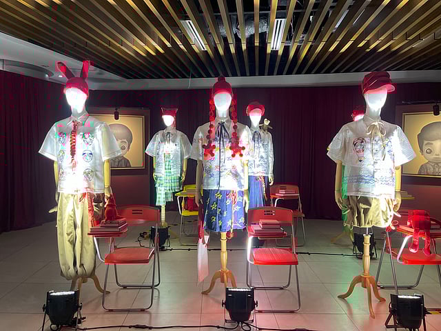 In contrast, “Guhit ng Gunita” explores memory, childhood, and nostalgia. The exhibit pairs fashion designer Daryl Maat — best known for his pad paper barongs worn by numerous celebrities — with visual artist SAIS, whose signature graphite and charcoal illustrations feature pop-surreal, emotive figures. Maat shared that working with SAIS challenged him in new ways.