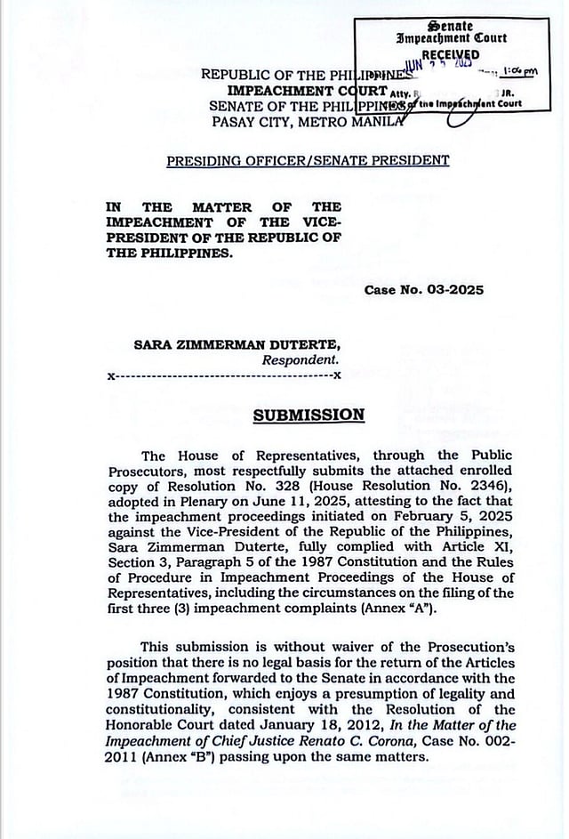 “This submission is without waiver of the prosecution’s position that there is no legal basis for the return of the articles of impeachment forwarded to the Senate in accordance with the 1987 Constitution,” the document reads.
