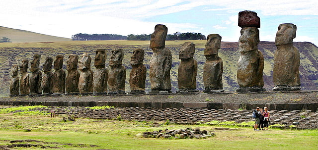 The 15 Tongariki moai, standing erect in rigid military attention, are the largest statues on the island. A tsunami washed these 30-ton statues over 300 meters away from the original podium and a generous grant from the Japanese government facilitated the restoration to its old grandeur.