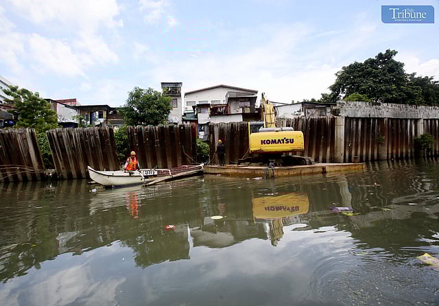 Engineer Joselito Manood of the DPWH Flood Control Management Cluster inspects the ongoing repair of damaged sheet piles along the San Juan River in Barangay Doña Imelda, Quezon City, on Friday, July 4, 2025. The sheet piles adjacent to residential areas were destroyed by flash floods triggered by Typhoon Carina last year.