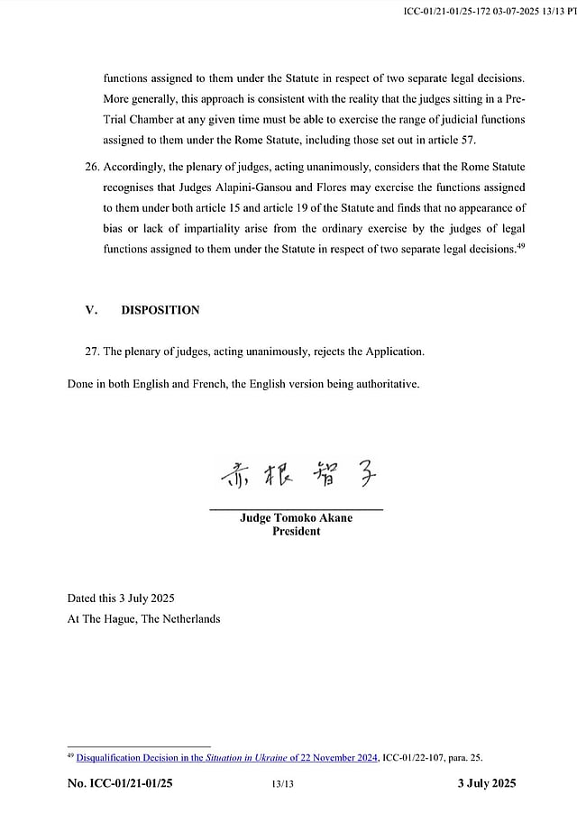 “The plenary of judges, acting unanimously, considers that no actual nor reasonable apprehension of bias arises in respect of Judges Alapini-Gansou and Flores. The plenary of judges considers that the judges acted, at all times, in accordance with the judicial duties assigned to them under the Statute,” read the decision penned by Judge Tomoko Akane, the ICC’s president.