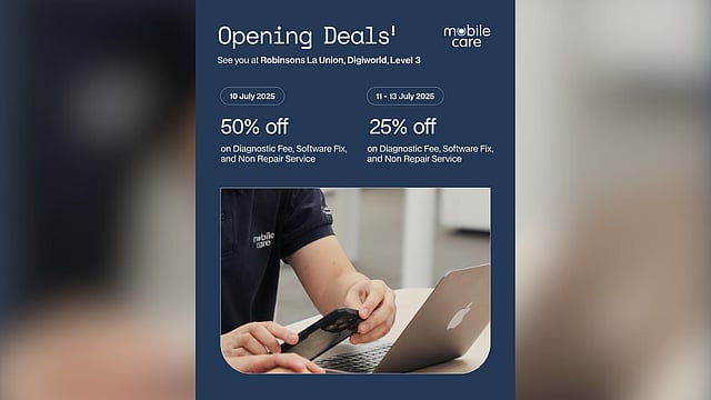 To celebrate the milestone, Mobile Care Robinsons La Union is offering limited-time discounts on select services. On 10 July, customers can avail of 50 percent off on diagnostic fees, software fixes, and non-repair services. From 11 to 13 July, these services will be offered at 25 percent off. Terms and conditions apply.