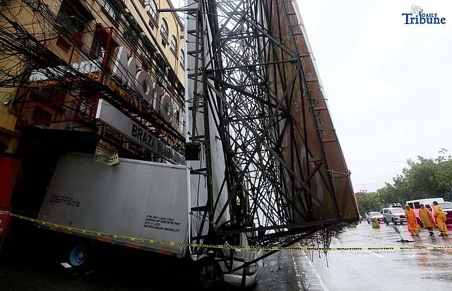 Bureau of Fire Protection personnel prepare to remove a collapsed billboard along the southbound lane of Katipunan Avenue in Quezon City on Saturday, July 19, 2025. The structure was toppled by strong winds around 11 a.m., brought by the Habagat intensified by Severe Tropical Storm Crising. Two vehicles reportedly crashed in the incident.Bureau of Fire Protection personnel prepare to remove a collapsed billboard along the southbound lane of Katipunan Avenue in Quezon City on Saturday, July 19, 2025. The structure was toppled by strong winds around 11 a.m., brought by the Habagat intensified by Severe Tropical Storm Crising. Two vehicles reportedly crashed in the incident.Bureau of Fire Protection personnel prepare to remove a collapsed billboard along the southbound lane of Katipunan Avenue in Quezon City on Saturday, July 19, 2025. The structure was toppled by strong winds around 11 a.m., brought by the Habagat intensified by Severe Tropical Storm Crising. Two vehicles reportedly crashed in the incident.Bureau of Fire Protection personnel prepare to remove a collapsed billboard along the southbound lane of Katipunan Avenue in Quezon City on Saturday, July 19, 2025. The structure was toppled by strong winds around 11 a.m., brought by the Habagat intensified by Severe Tropical Storm Crising. Two vehicles reportedly crashed in the incident.