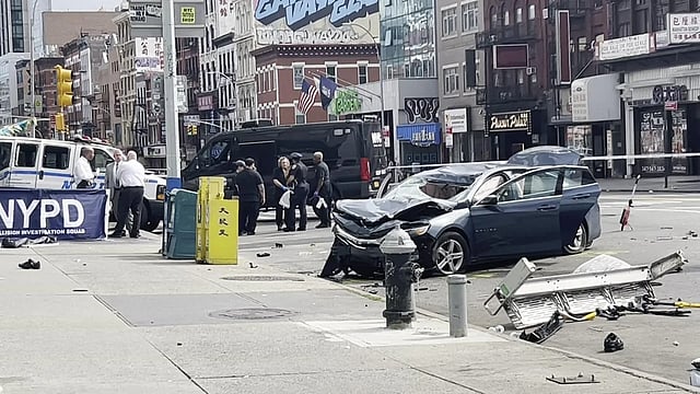 Police said the vehicle veered onto the sidewalk, hitting a male cyclist and a female pedestrian. The car also collided with an unoccupied NYPD van parked nearby.