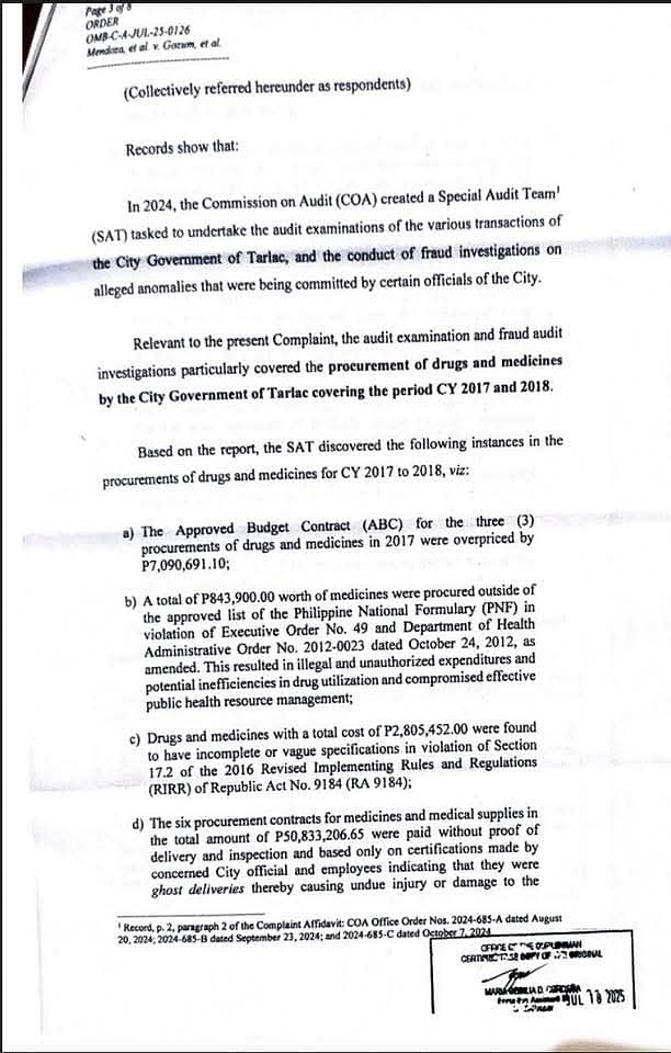 TARLAC CITY, Tarlac — The Office of the Ombudsman has ordered the preventive suspension of 13 officials from Tarlac City in connection with an alleged P100-million medicine procurement scam uncovered by government auditors.