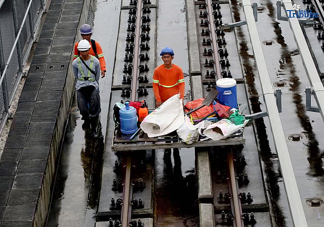 MRT-7 workers walk along the train tracks near Batasan Station on Commonwealth Avenue, Quezon City, on Wednesday, July 23, 2025. The 22-kilometer elevated railway project—connecting Metro Manila and Bulacan through 14 stations—is now 83.08% complete. Trial runs are expected to begin by the end of 2025, with full operations targeted for 2026 and a projected daily ridership of 600,000. ANALY LABOR