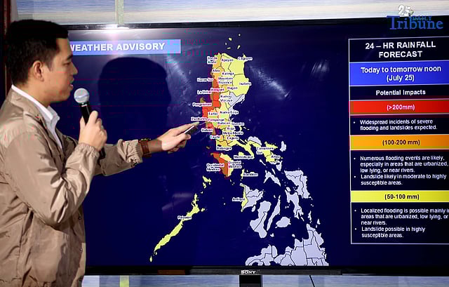 PAGASA weather specialist Benison Estareja briefs the public on the latest developments on Tropical Storm Dante and Typhoon Emong at the PAGASA Weather and Flood Forecasting Center on Thursday, July 24, 2025. Estareja warned of potential storm surges and flooding in several areas as both systems continue to affect the country’s weather. Photo by Analy Labor for DAILY TRIBUNE