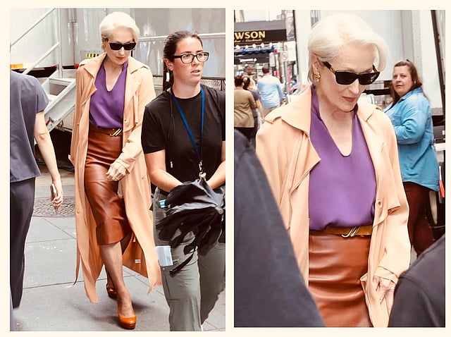 Seen striding through Midtown Manhattan, Streep, 76, turned heads in a sleek khaki trench coat, a belted brown pencil skirt, and a striking purple V-neck blouse. She completed the look with matching pumps, dark sunglasses, and understated gold earrings — exuding the same commanding aura that made Miranda Priestly a pop culture legend.
