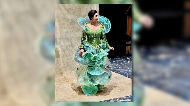 Act Two unveils a darker, richer interpretation of the character. Here, Laurel and Ong explored deeper green hues, symbolizing decay, mystery and power. The bodice, intricately embroidered with flora inspired by the vegetables from the beloved folk song Bahay Kubo, is a playful yet poignant tribute to local agriculture and sustainability—a whimsical detail with cultural depth.