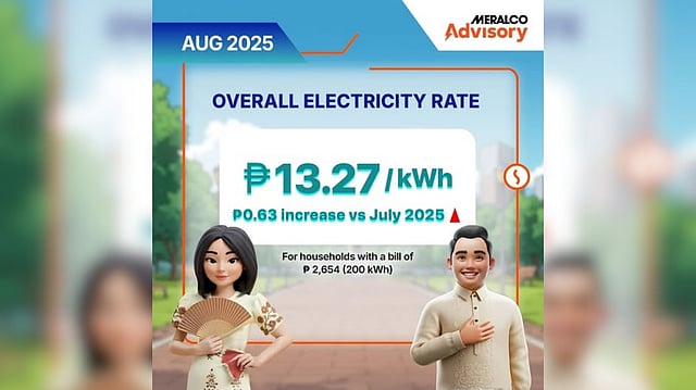 At a media briefing on Tuesday, Meralco vice president and head of Corporate Communications Joe R. Zaldarriaga said the adjustment brings the overall rate to P13.2703 per kWh from P12.6435 in July.