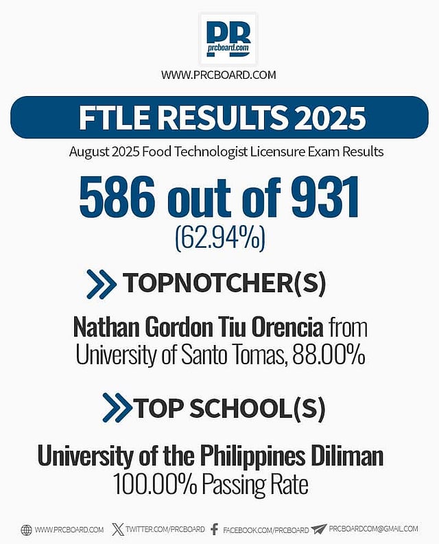 The Professional Regulation Commission (PRC) announced that 586 out of 931 examinees passed the Food Technologists Licensure Examination held 14 and 15 August.