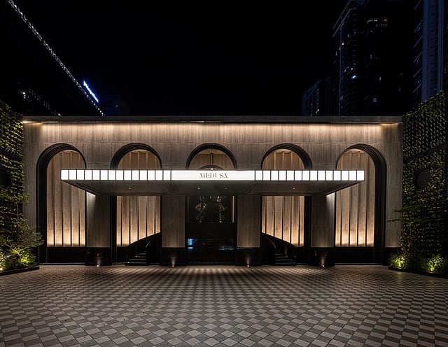 Medusa showcases impressive Art Deco influences with tropical details in its interiors. The new luxe habitué boasts of brilliant and thoughtful lighting, spatial rhythm and layered textures. Deep-toned velvets, high-gloss lacquer, marble, mirrored surfaces and tinted brass define the palette, while programmable lighting shifts the mood throughout the night.
