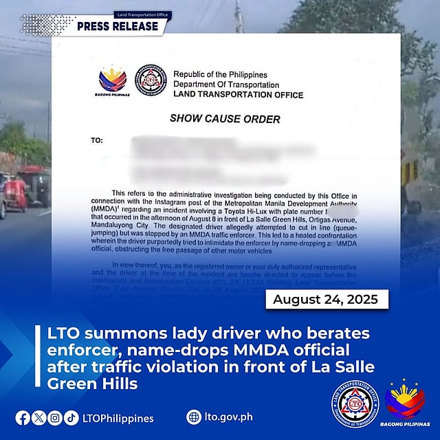 The SCVO followed a complaint received by LTO Executive Director Greg G. Pua, Jr. from the MMDA regarding the incident. According to the complaint, the driver attempted to cut in line but was stopped by an MMDA traffic enforcer. The driver then allegedly berated the enforcer and tried to intimidate them by name-dropping an MMDA official, obstructing the passage of other vehicles.