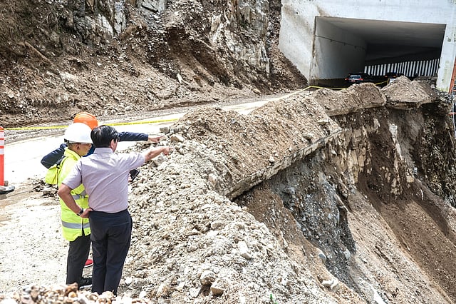 The President, joined by Baguio City Mayor Benjamin Magalong, inspected the P264-million Department of Public Works and Highways (DPWH) project, which was completed only in April but has since fallen into “precarious condition.”