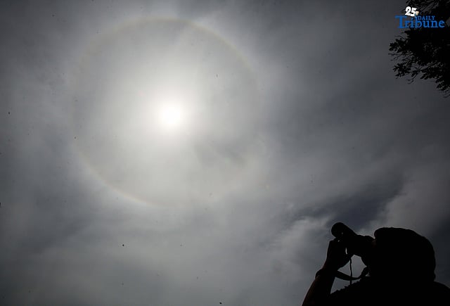 A photographer captures a visible sun halo in Quezon City on Monday. The atmospheric phenomenon occurs when sunlight refracts and reflects off tiny ice crystals suspended in high-altitude cirrus clouds. Photograph by Analy Labor for DAILY TRIBUNE