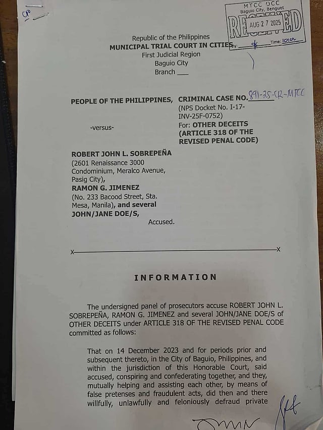 Named in the information are former CJHDevCo Chairman of the Board of Directors Robert John L. Sobrepeña and Fil-Estate Management Inc. (FEMI) Vice President and former CJHDevCo board member Ramon G. Jimenez, along with several unidentified “John Does.”