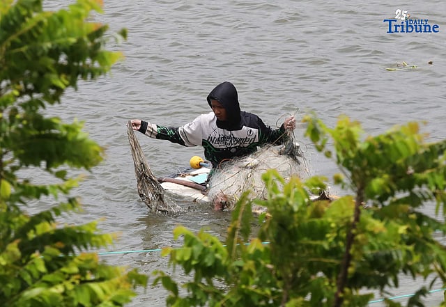 A man riding a makeshift styrofoam boat is seen fishing in Tanza, Navotas City on Thursday, 28 August 2025.