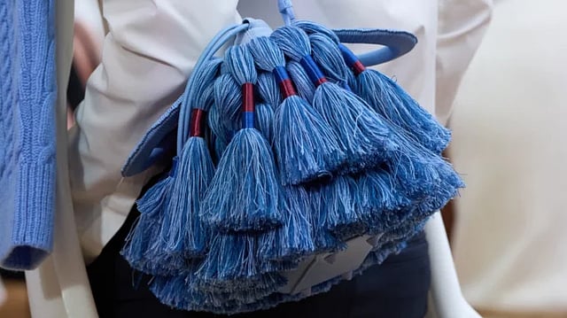 Another unusual creation from Anderson: a handbag decorated with tassel fringe, “akin to what one sees (on draperies at Versailles),” as Purse Bop commented. “The bag appeared on the runway in several shades, including cornflower blue, ecru and red. It features the iconic Dior charms, similar to those on the Lady Dior bag, in a mix of gold-tone and tone-on-tone finishes, adding a subtle touch of detail,” the site further described.
