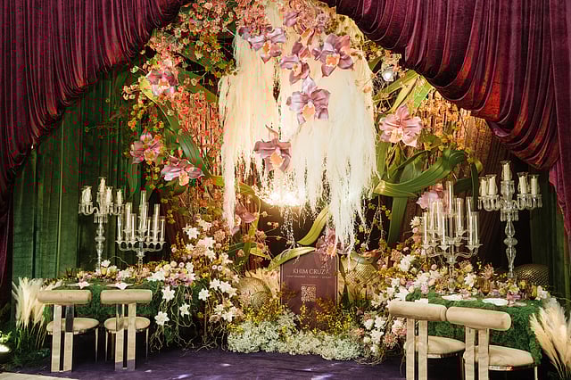 Khim Cruz, exhibiting in Manila for the first time, proudly brought Davao to the capital. Giant orchids and waling-walings cascaded from the ceiling, framed by lush tropical leaves. Mossy tablescapes were punctuated with real florals, while napkin rings shaped like waling-walings carried the theme down to the smallest detail. It was more than just design — it was cultural storytelling, layered with identity and regional pride. Khim’s vignette proved that weddings don’t only borrow from global trends — they can just as powerfully draw from the richness of our own landscapes.