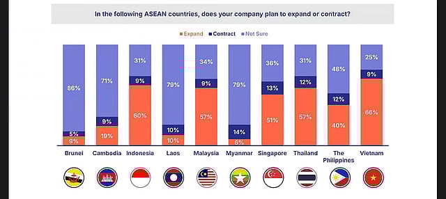 In several key ASEAN markets, a majority of respondents continue to plan for expansion, with Vietnam (66%), Indonesia (60%), Thailand (57%) and Malaysia (57%) ranking in the top three for plans to expand.