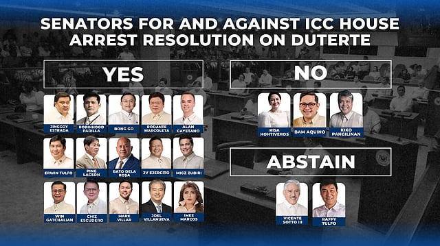 Fifteen senators voted in favor of the resolution. Meanwhile, Senators Bam Aquino, Risa Hontiveros, and Francis "Kiko" Pangilinan voted against it. Senators Lito Lapid and Raffy Tulfo abstained.