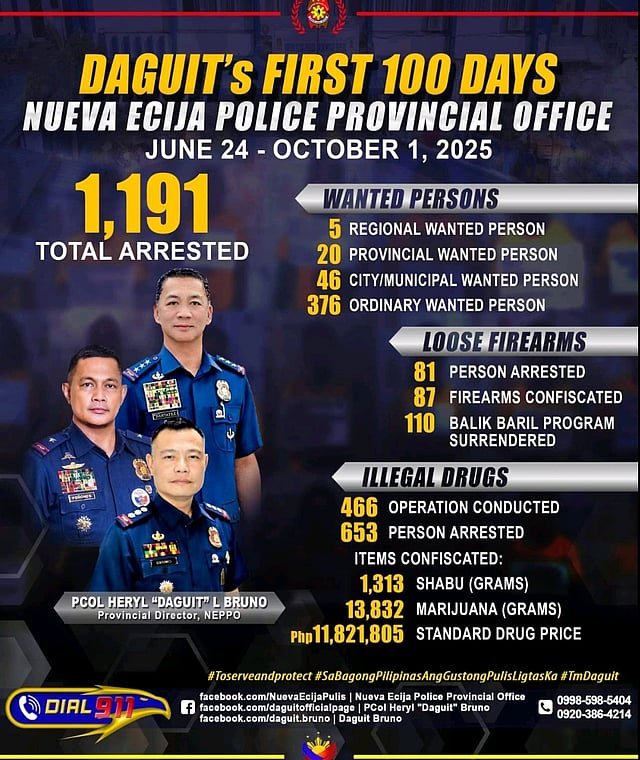 Marking his 100th day in office, Provincial Director Heryl Bruno commended the Nueva Ecija police force for their outstanding performance. Bruno hailed the operation as a major victory in the ongoing fight against crime and illegal drugs, vowing to maintain relentless pressure on criminal elements in the province.