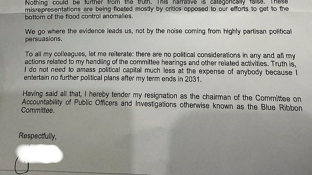Senate President Pro Tempore Panfilo “Ping” Lacson on Monday formally resigned as chairperson of the Senate Blue Ribbon Committee amid disagreements with some of his colleagues over the direction of the panel’s ongoing probe into alleged irregularities in flood control projects.