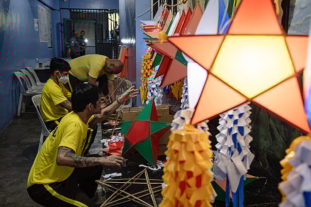 Persons Deprived of Liberty (PDLs) craft Christmas lanterns inside the Bureau of Jail Management and Penology (BJMP) Metro Manila District Jail Annex 2 in Taguig City on Tuesday, 7 October 2025.