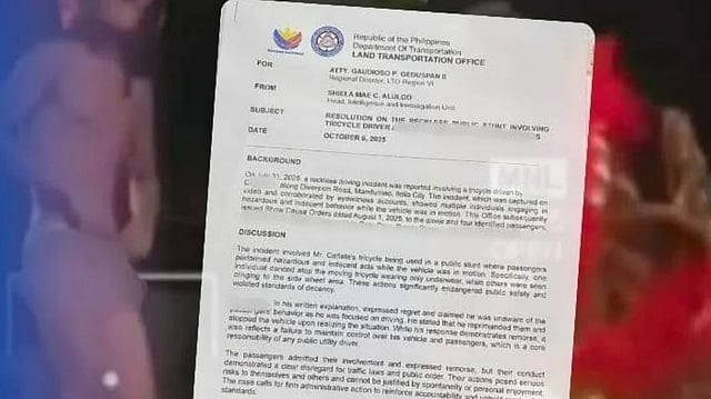 The tricycle driver was not spared. His license was suspended for one year and ordered surrendered immediately for allowing the stunt to happen under his watch. Geduspan said the driver’s failure to intervene showed “gross negligence” in his duty as a public utility operator.