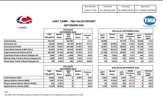 Based on the joint report of the Chamber of Automotive Manufacturers of the Philippines, Inc. (CAMPI) and the Truck Manufacturers Association (TMA) released Thursday, total industry sales in September 2025 reached 38,029 units, slightly higher than the 36,174 units sold in August.