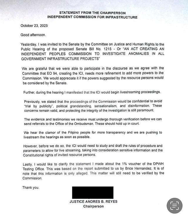 The Independent Commission for Infrastructure (ICI) is considering live streaming its hearings following public calls for greater transparency, according to a statement from ICI Chairperson Justice Andres Reyes.