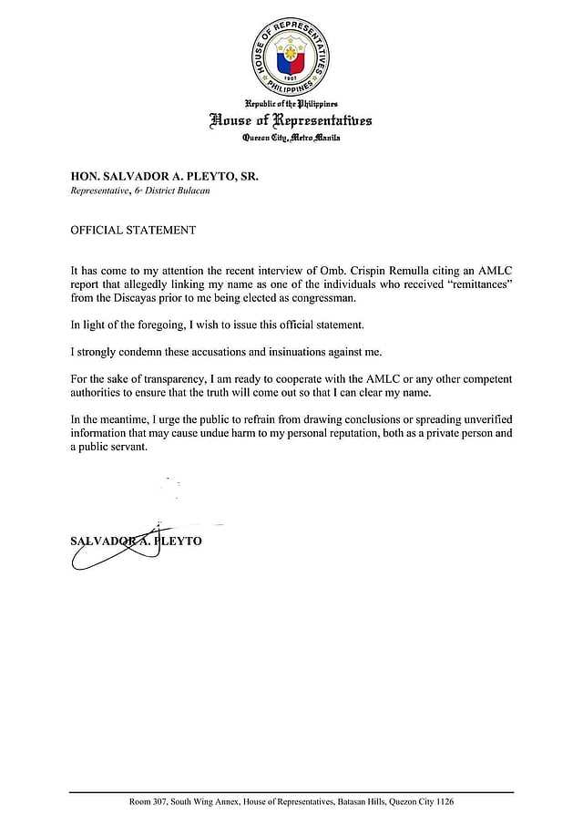 “It has come to my attention, the recent interview of Omb. Crispin Remulla citing an AMLC report allegedly linking my name as one of the individuals who received ‘remittances’ from the Discayas prior to me being elected as congressman,” Pleyto said in a statement.