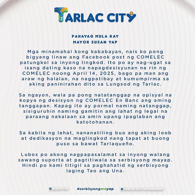 Tarlac Mayor Susan Yap has issued a statement regarding her alleged disqualification case from the Commission on Elections (Comelec).