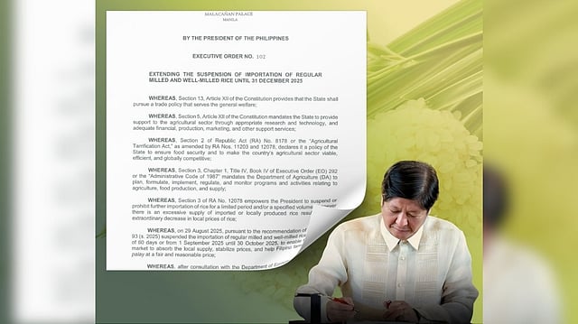 President Ferdinand R. Marcos Jr. signed Executive Order (EO) 102 yesterday, extending the suspension of the importation of regular milled and well-milled rice until 31 December 2025 to protect local farmers and stabilize the domestic rice market, Malacañang said Wednesday.