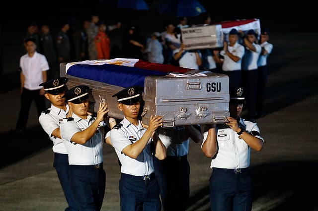 The remains of the four personnel of the ill-fated Super Huey Helicopter 211 of the 505th Search and Rescue Group of the Philippine Air Force are given arrival honors at the Villamore Air Base in Pasay City on 06 November 2025. Also known as Angel 211, the helicopter crashed in Loreto, Agusan del Sur, on 04 November.