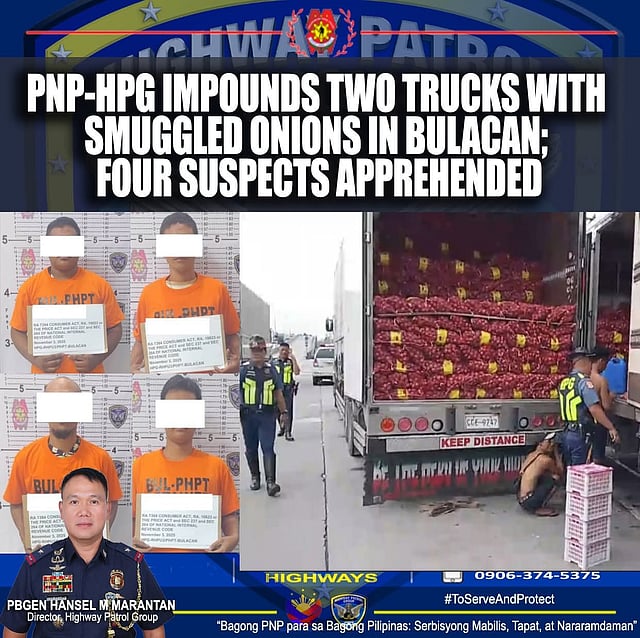 Two trucks loaded with smuggled onions were seized by the Philippine National Police–Highway Patrol Group (PNP-HPG) at the Bypass Road, Balagtas Exit in Bulacan on 3 November 2025.