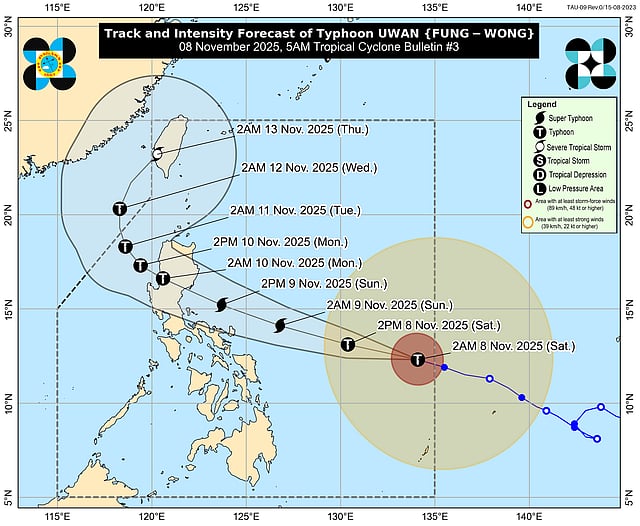 Uwan is expected to rapidly strengthen into a super typhoon tonight or by Sunday morning (November 9) and may make landfall at or near its peak intensity over the southern portion of Isabela or northern Aurora late Sunday evening or early Monday morning (November 10). After crossing the mountainous terrain of Northern Luzon, the typhoon is projected to emerge over the West Philippine Sea by Monday morning or afternoon.