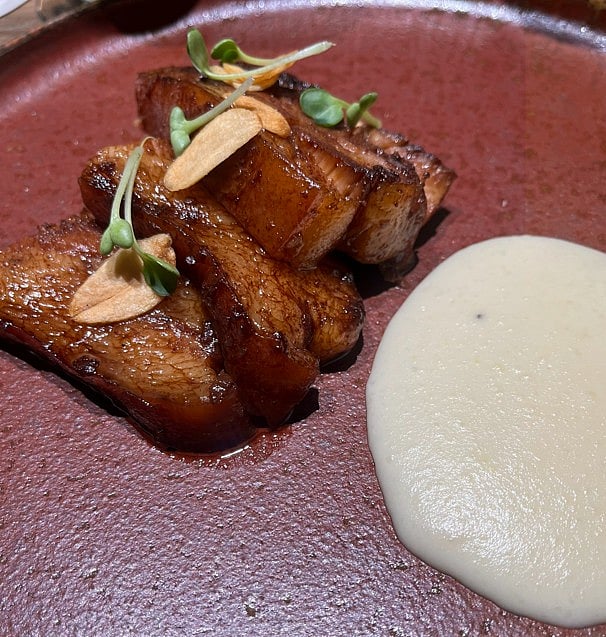 Then, San Miguel Cerveza Blanca, a spicy, smoky, and fruity beer, accompanied Juniper’s signature and succulent Pork Chop that still haunts me—French-cut, brined for six hours, pan-seared to a golden crust, and oven-roasted to perfection, paired with a tangy mustard and savory M1 sauce.