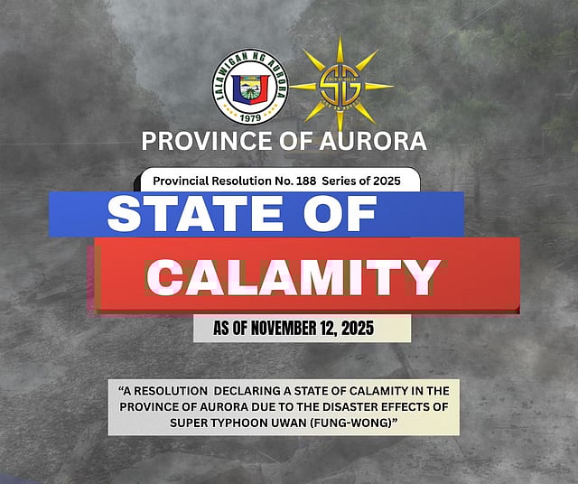During the session of the Sangguniang Panlalawigan on 11 November, Aurora was officially placed under a State of Calamity through Resolution No. 188, Series of 2025, or A Resolution Declaring a State of Calamity in the Province of Aurora Due to the Disaster Effects of Super Typhoon Uwan.