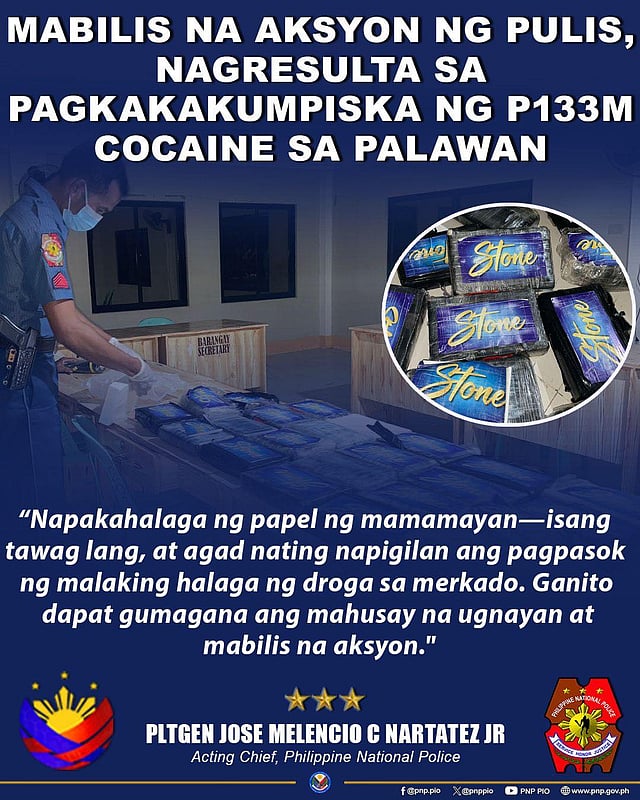 Some P133 million worth of suspected cocaine were discovered along the coastal area of Linapacan, Palawan on 18 November 2025.