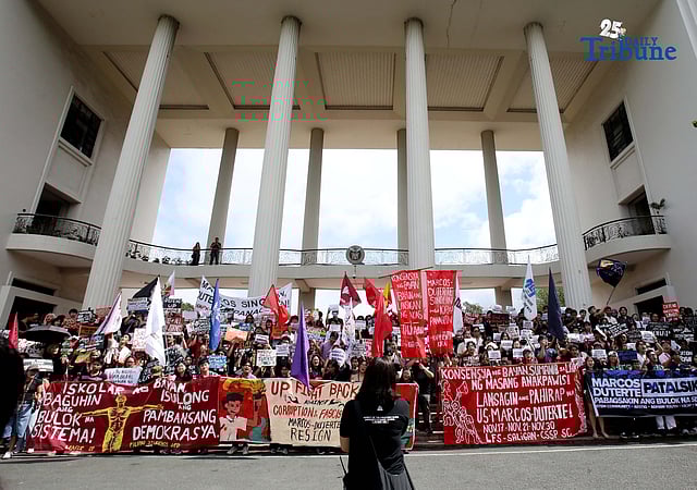 The protest coincided with the Department of Public Works and Highways (DPWH) and the Independent Commission for Infrastructure submitting a referral to the Office of the Ombudsman for the filing of plunder, graft, and direct bribery charges against former House Speaker Martin Romualdez. Photo by Analy Labor for Daily Tribune