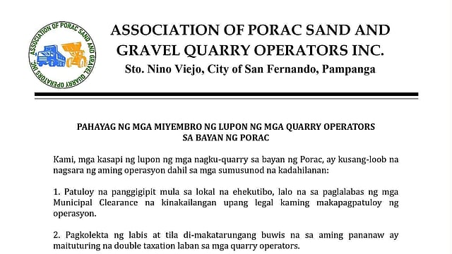 The Association of Porac Sand and Gravel Quarry Operators Inc. cited delayed municipal clearances, inconsistent administrative processes, and allegedly excessive taxes—almost double the usual amount—as reasons for halting operations.