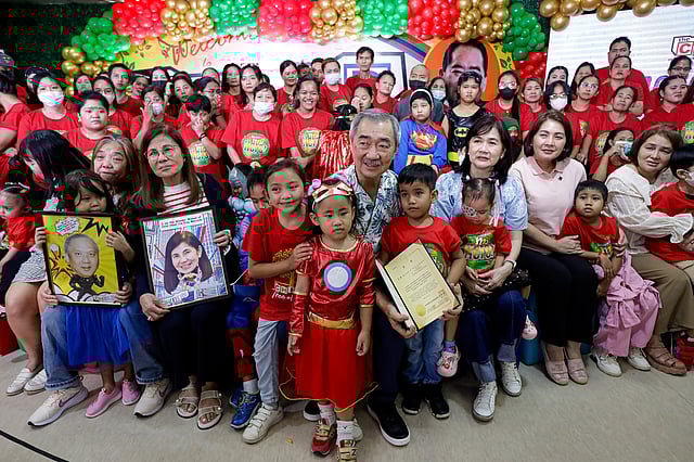 SM Prime Holdings CEO Hans Sy and Center for Health Improvement and Life Development (CHILD) Haus founder Mader Ricky Reyes distribute gifts to children with cancer during the charity organization's "Heroes of Hope" Christmas party in Manila on Sunday, 30 November 2025.