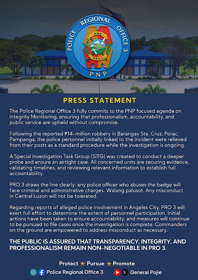 The Police Regional Office 3 (PRO3) said on 4 December 2025, that it has relieved police personnel linked to the P14-million robbery incident in Barangay Sta. Cruz, Porac, Pampanga.