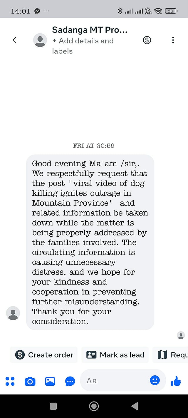 A message reportedly sent by the LGU requested the removal of the post titled “viral video of dog killing ignites outrage in Mountain Province,” saying the “circulating information is causing unnecessary distress” and that the matter should be handled by the families involved. The LGU appealed for “kindness and cooperation” to prevent further misunderstanding.