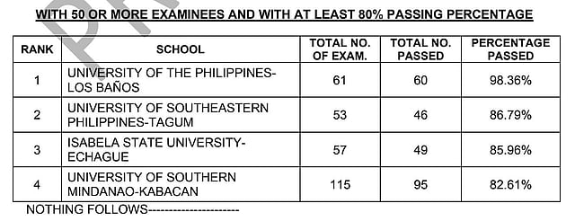 Out of 2,494 examinees, 1,475 passed, resulting in a 59.06 percent passing rate. The University of the Philippines Los Baños was the top-performing school with a 98.36 percent passing rate, followed by the University of Southern Philippines–Tagum with 86.79 percent, Isabela State University–Echague with 85.96 percent, and University of Southern Mindanao–Kabacan with 82.61 percent.